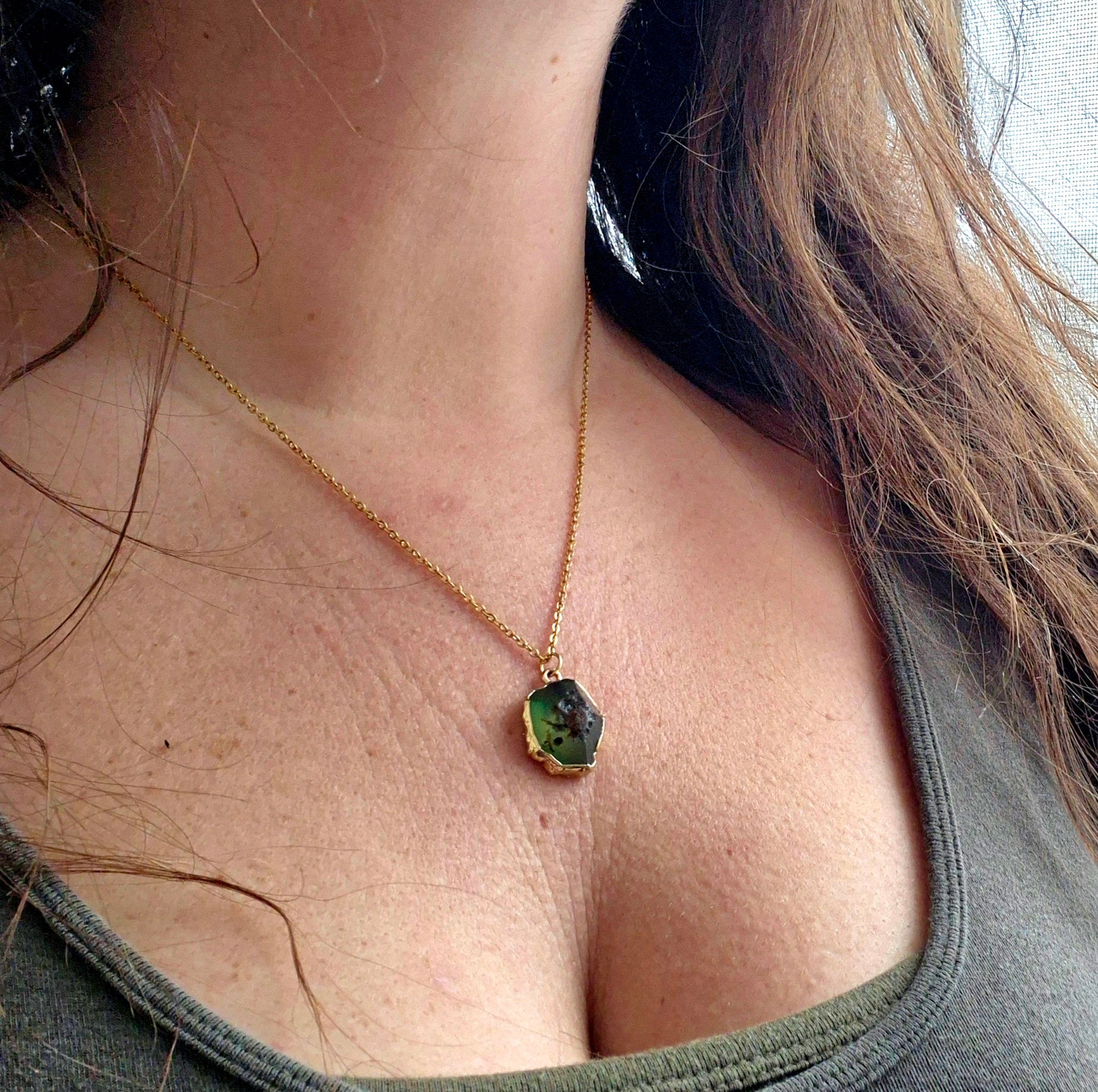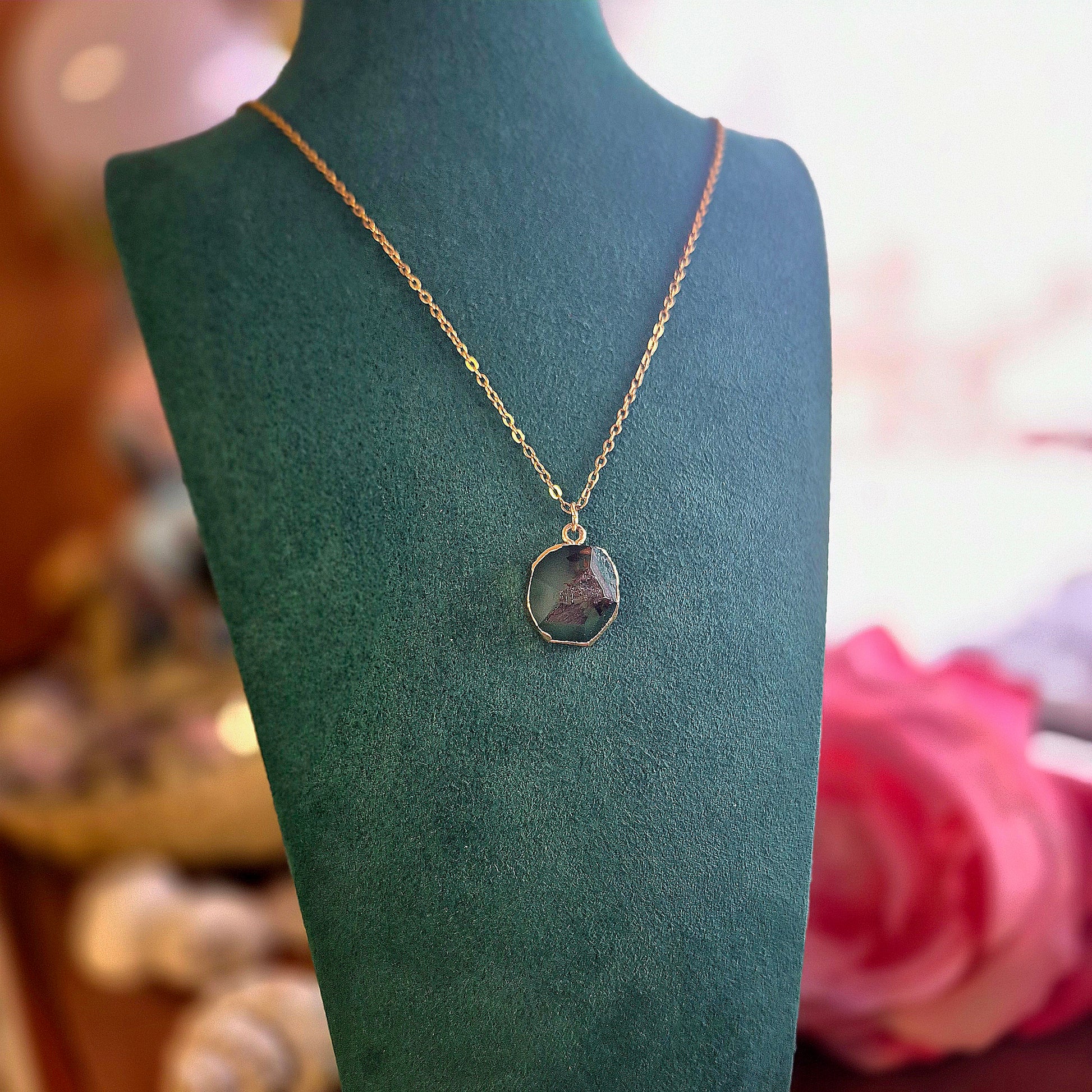 Véritable agate verte sertie de feuille d'or et montée sur une chaine en acier inoxydable.