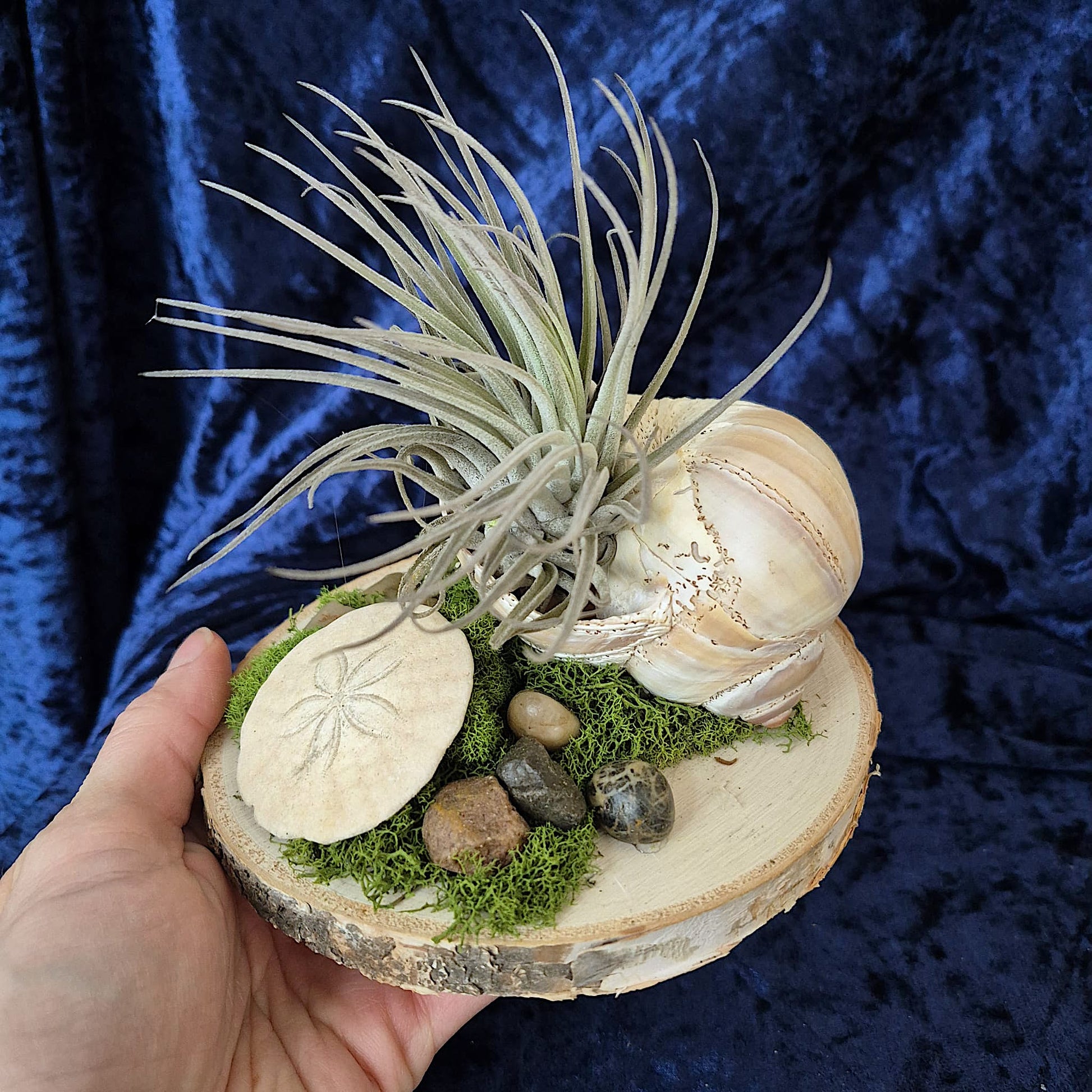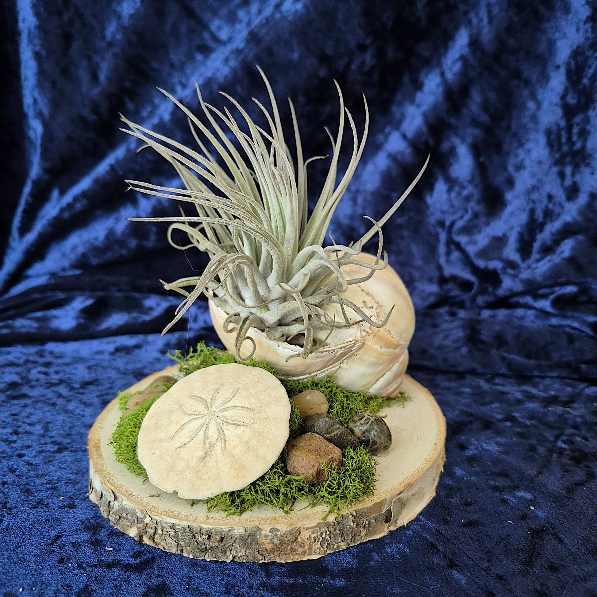 - Les coquillages, le sable, la mousse et les plantes qui composent les arrangements sont véritables. Chaque arrangement est donc unique. La taille, la couleur et les particularités de chaque création varie d'un modèle à l'autre.
